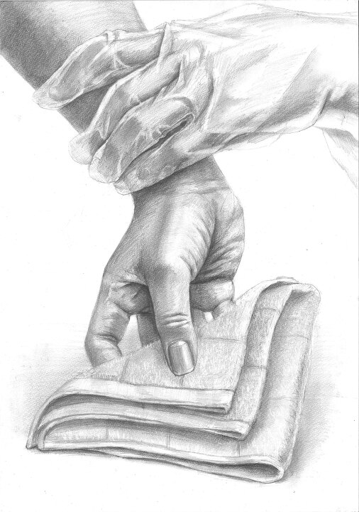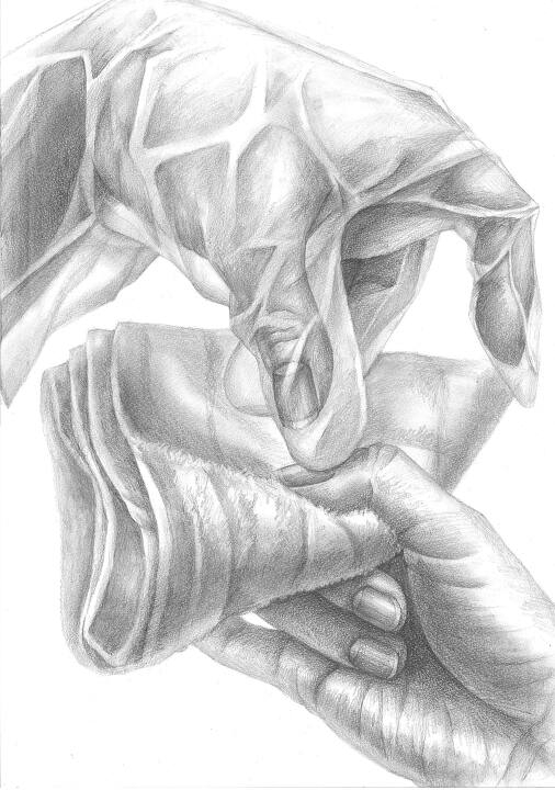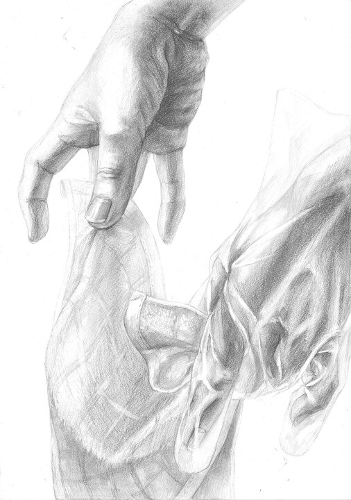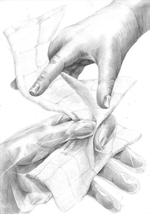 自身の手、与えられた手袋とハンドタオルを自由に構成して、奥行きを感じさせる描写をしなさい。試験時間4時間