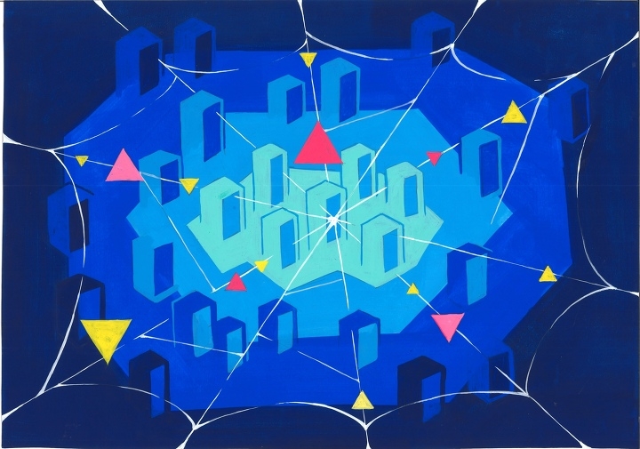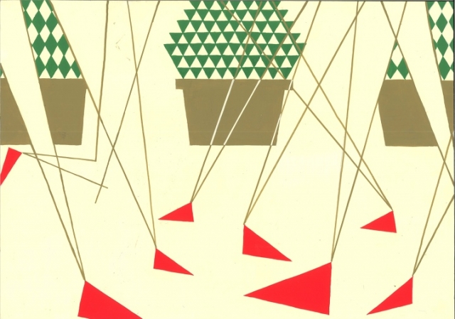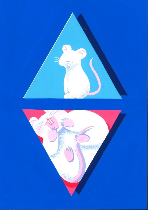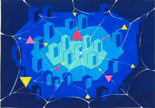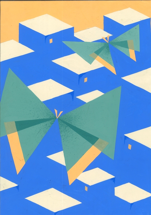 「自然」と「都市」から発想を広げ、色彩構成をしなさい。画面内に、正三角形を効果的に配置すること(正三角形は、単数でも複数でも可。作品のタイトルと意図を説明用紙に100字以内で記入しなさい。)