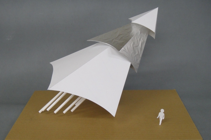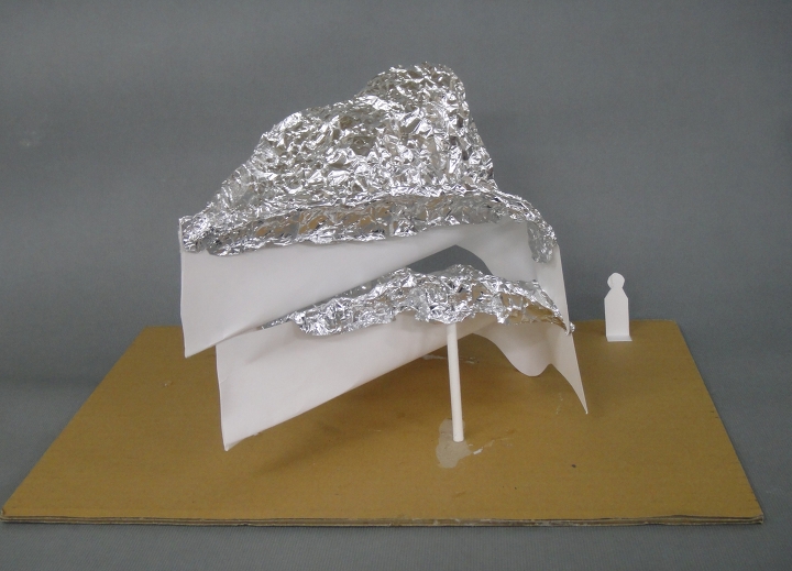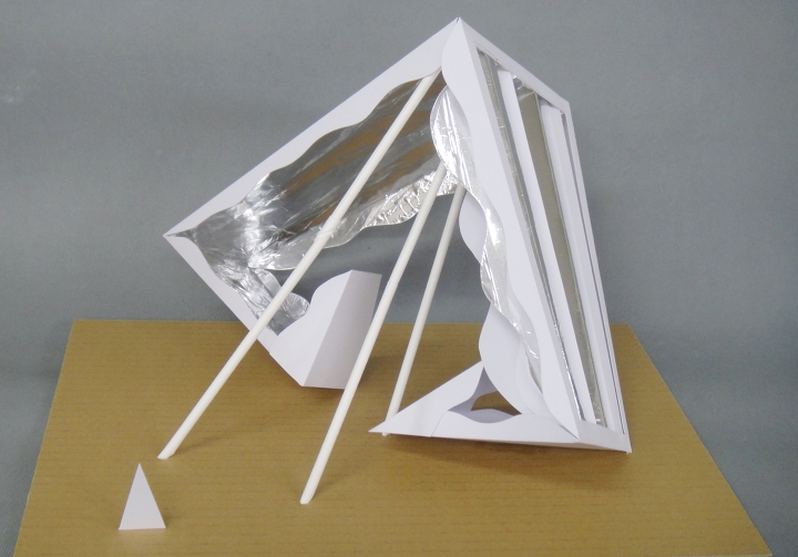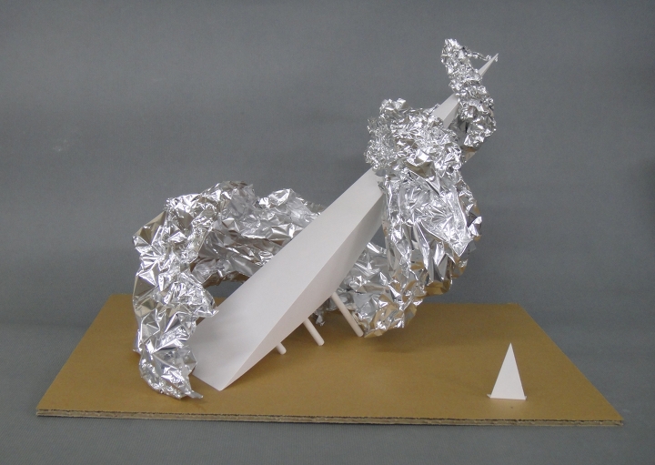 テーマ「纏う(まとう)」与えられた材料「アルミホイル」と「紙ストロー」、「ケント紙」を用いて「纏う」をテーマに立体を構成しなさい。(作品のタイトルと意図を説明用紙に100字以内で記入しなさい。)
