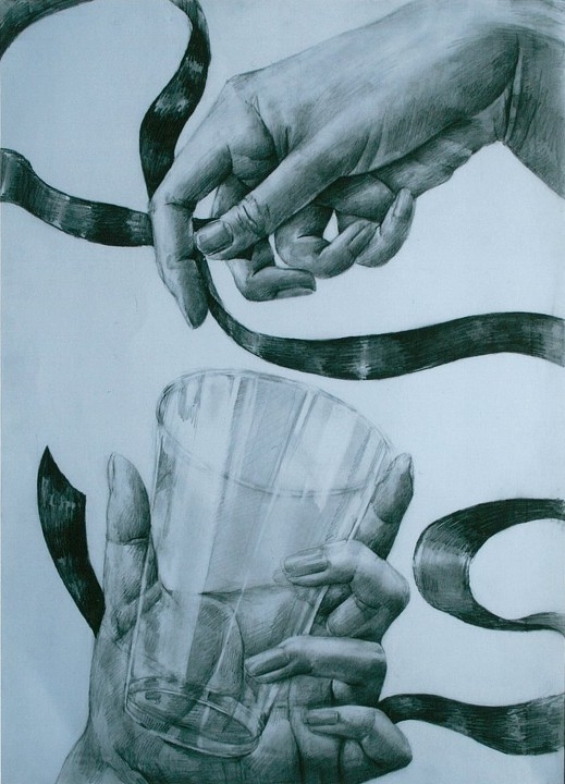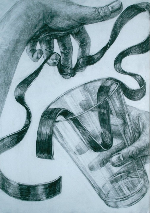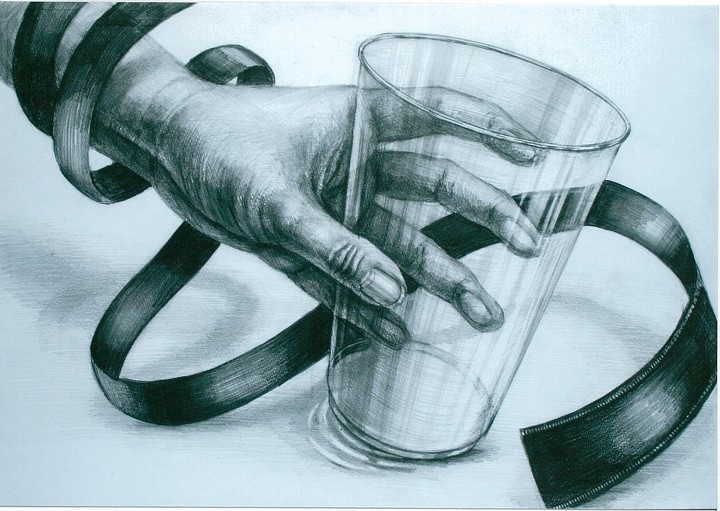 赤い光沢のある布テープと、プラコップに、自分の手を加えて自由に構成し、デッサンしなさい。