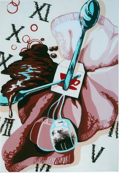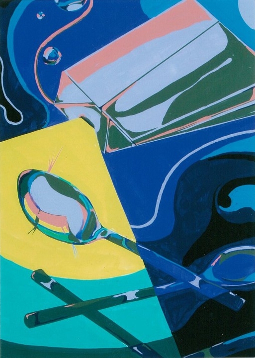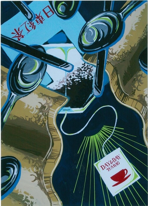 ティ-パックと、スプーンと、白いハンドタオルからイメージを展開し、自由に色彩構成をしなさい。作品にはタイトルをつけること。