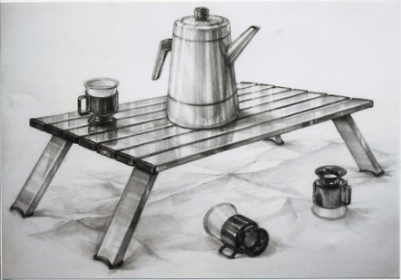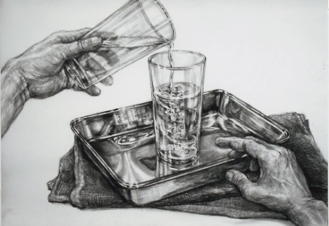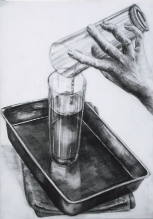 タオル上の金属トレイの中にあるコップに、手に持ったコップから水を注いでいるところを想像しデッサンしなさい。
