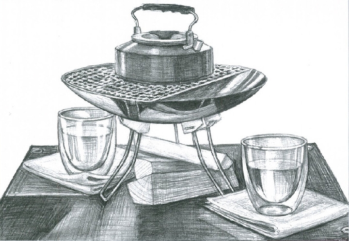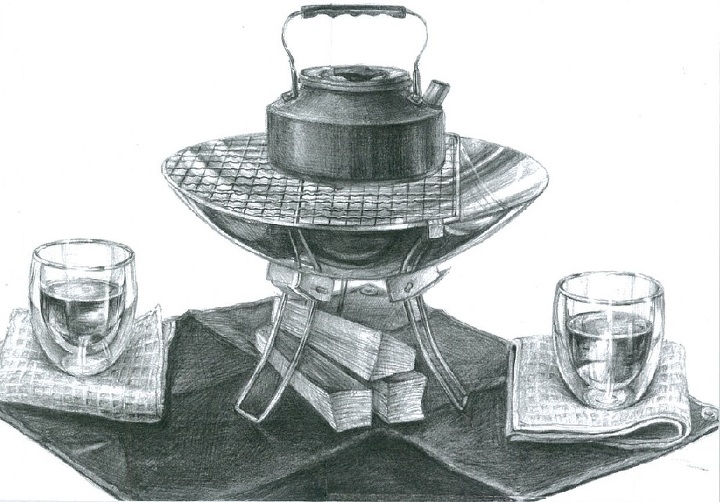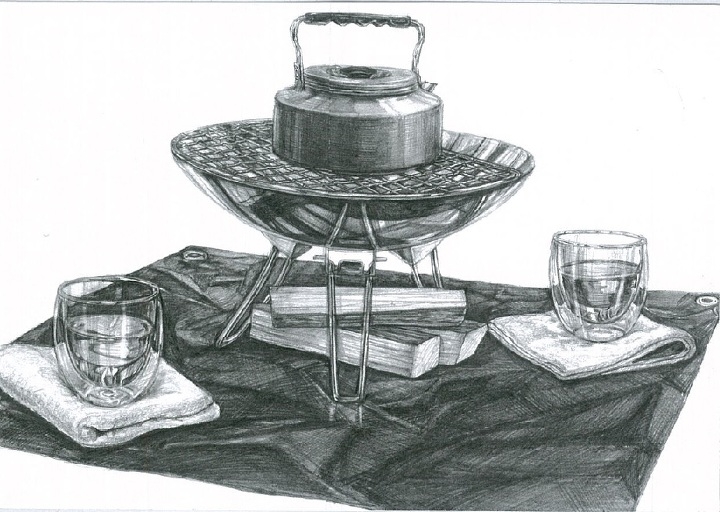 ・焚き火台コールマン ・やかん ・ボダムのコップ2個 ・模様の入ったタオル2枚