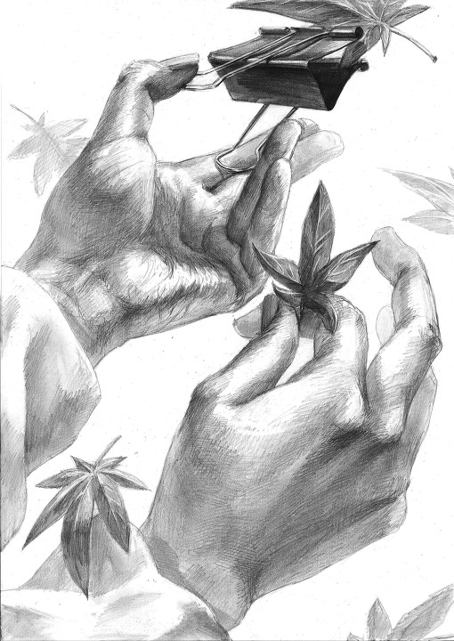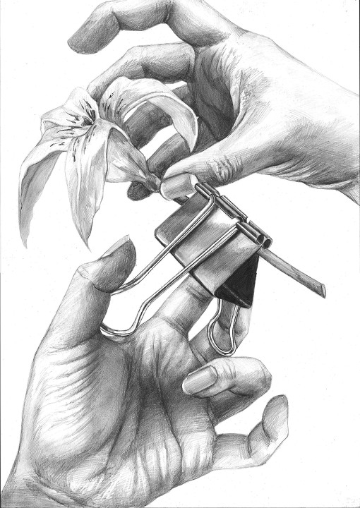 「自分の手」と「想定の植物」と「クリップ」を自由に構成し、デッサンしなさい。 -