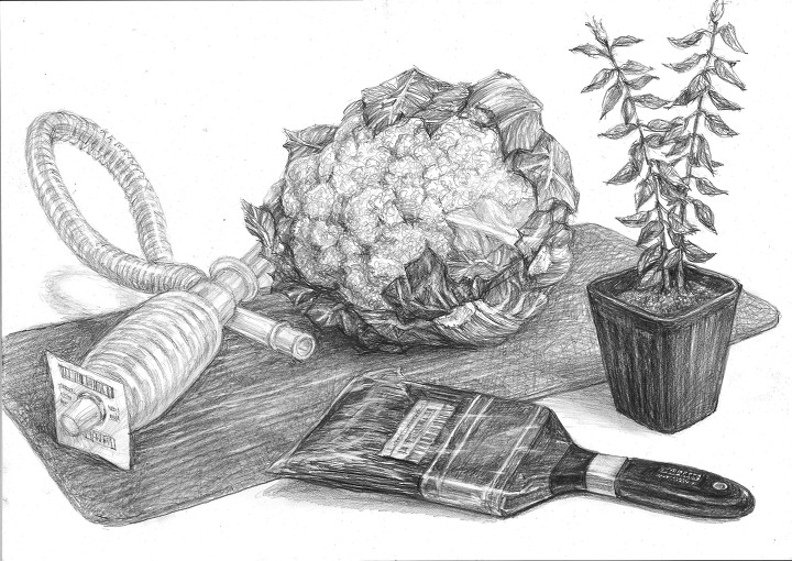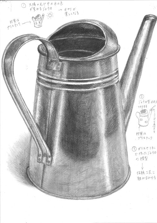 作品写真: 17 鉛筆デッサン : ジョウロ を各自で自由に配置しデッサンしなさい。